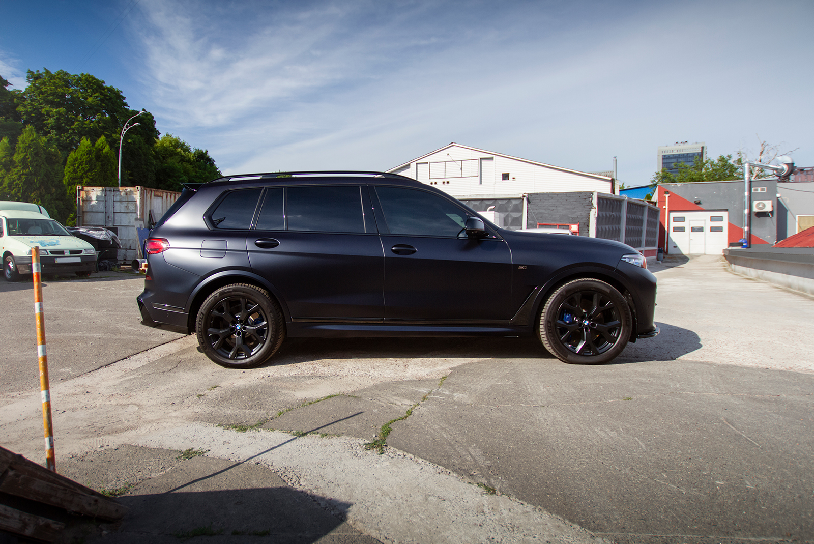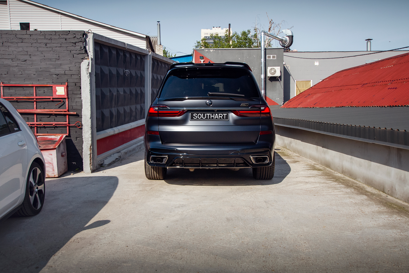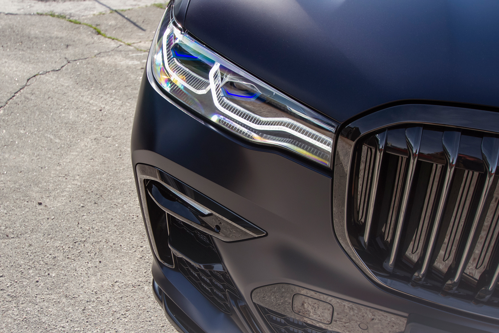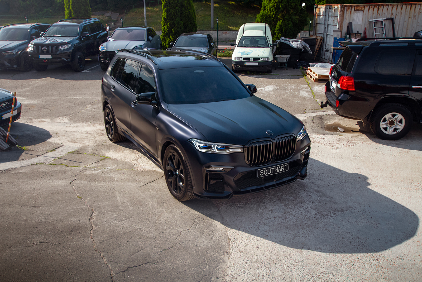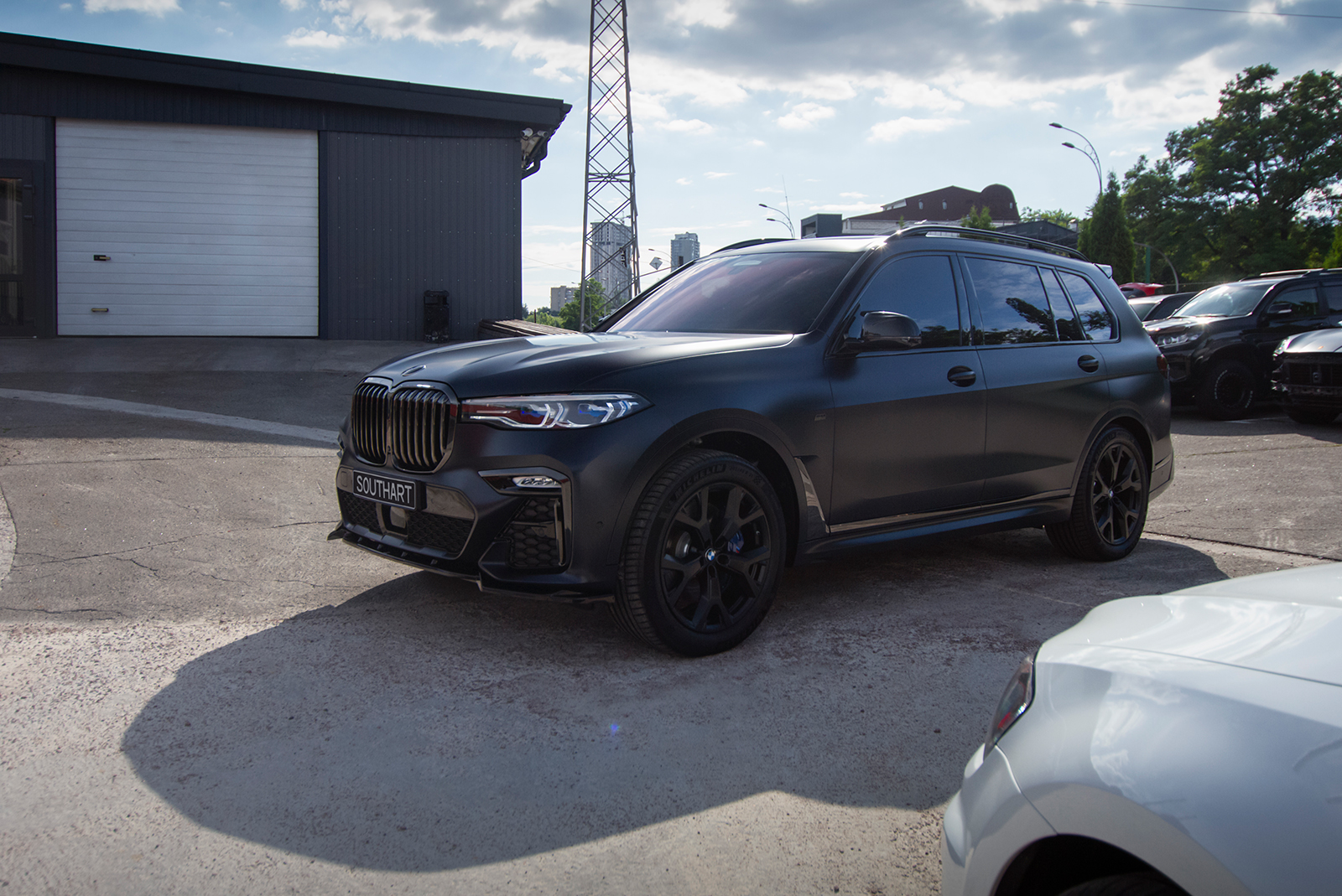 BMW X7 в сатиновій захисній поліуретановій плівці, з додатково встановленими елементами обісу, та карбоном в салоні