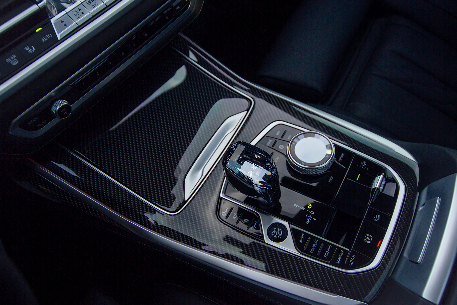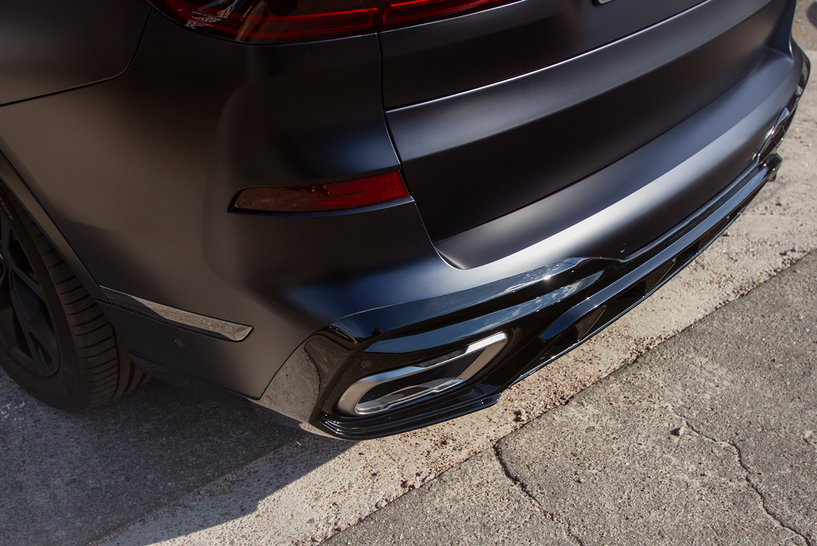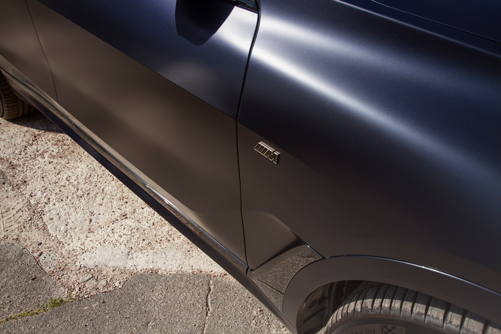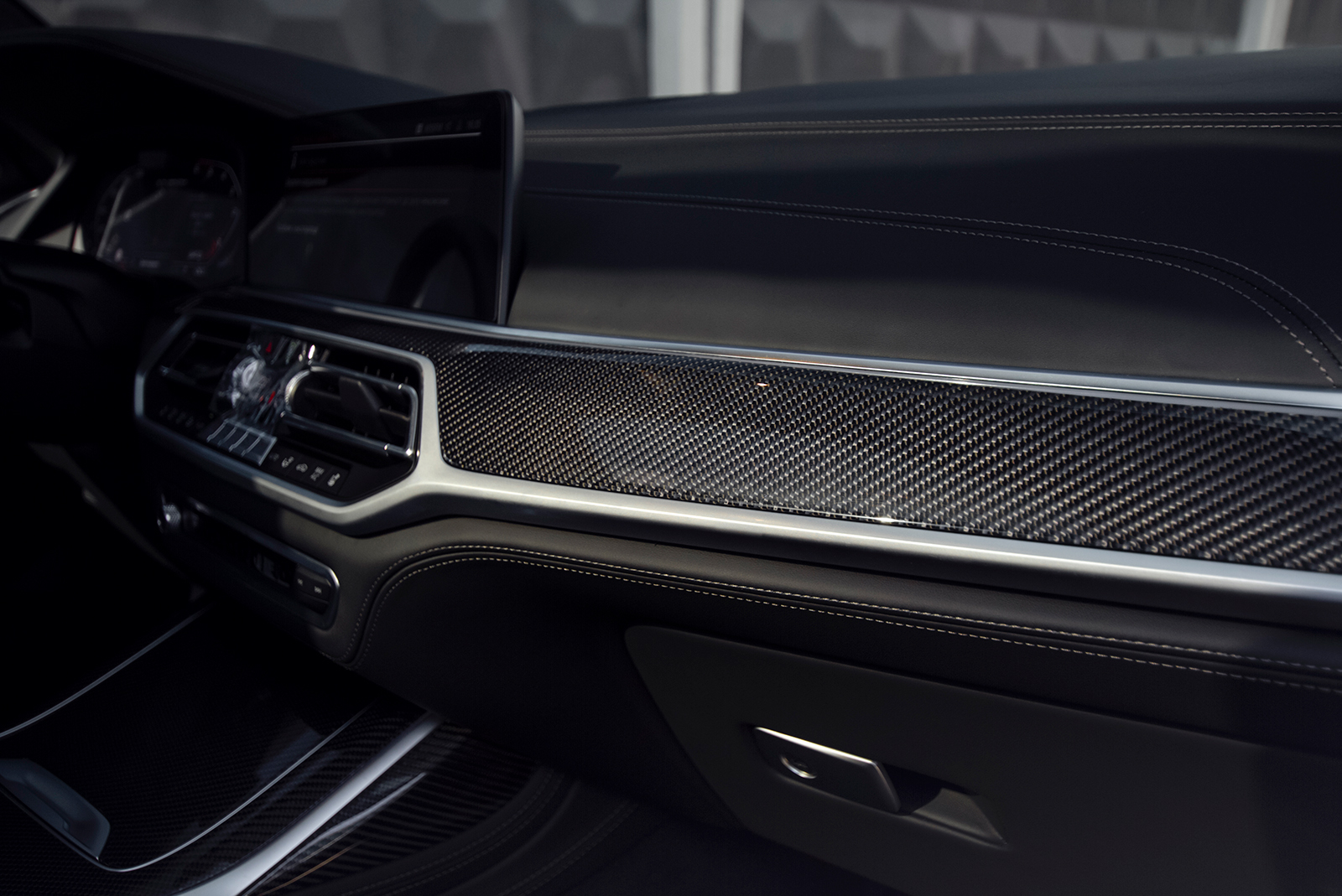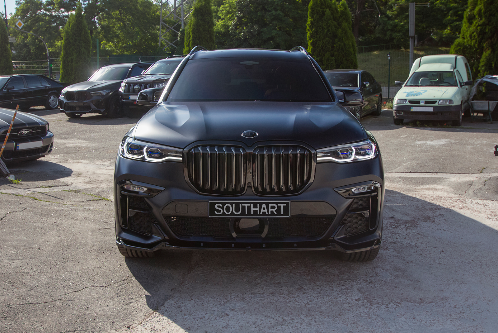 BMW X7 в сатиновій захисній поліуретановій плівці, з додатково встановленими елементами обісу, та карбоном в салоні