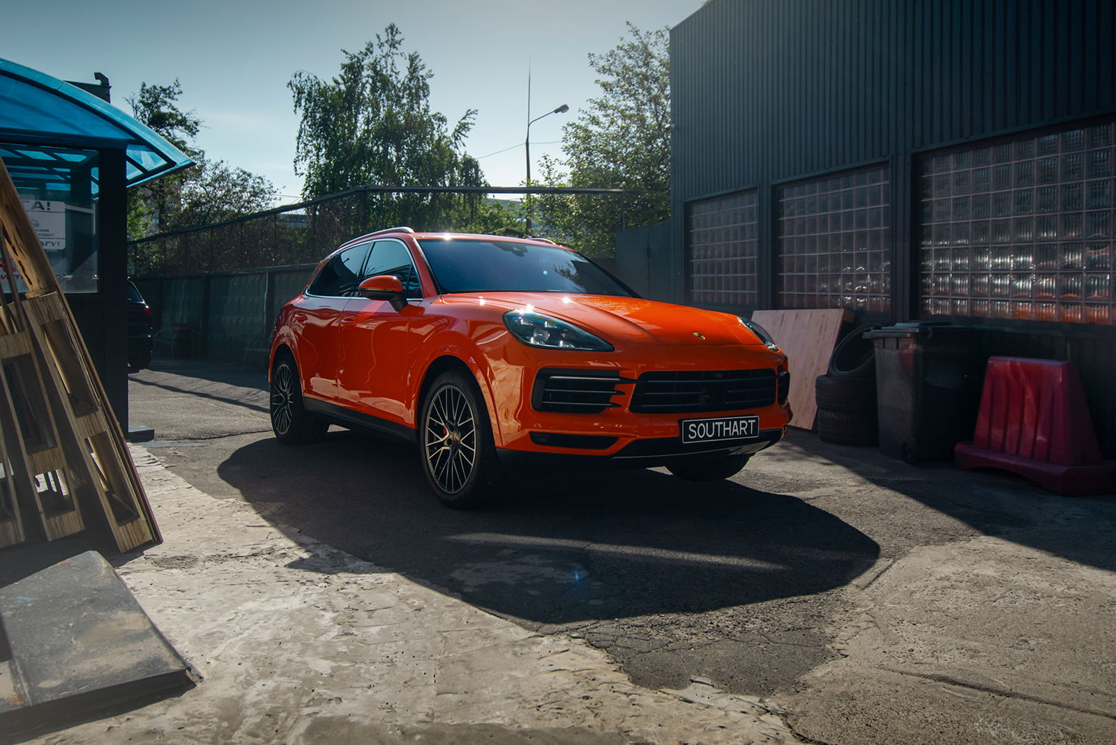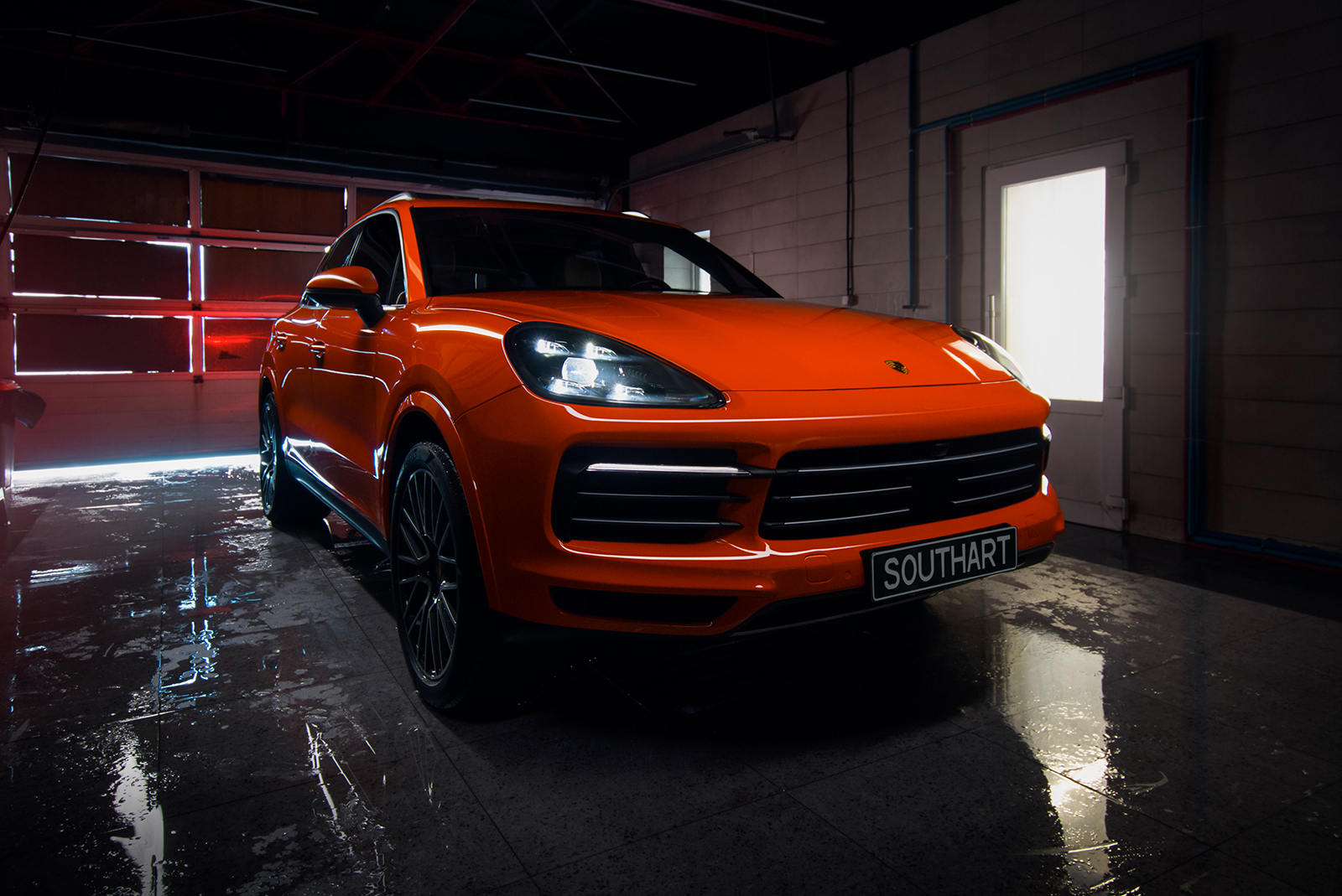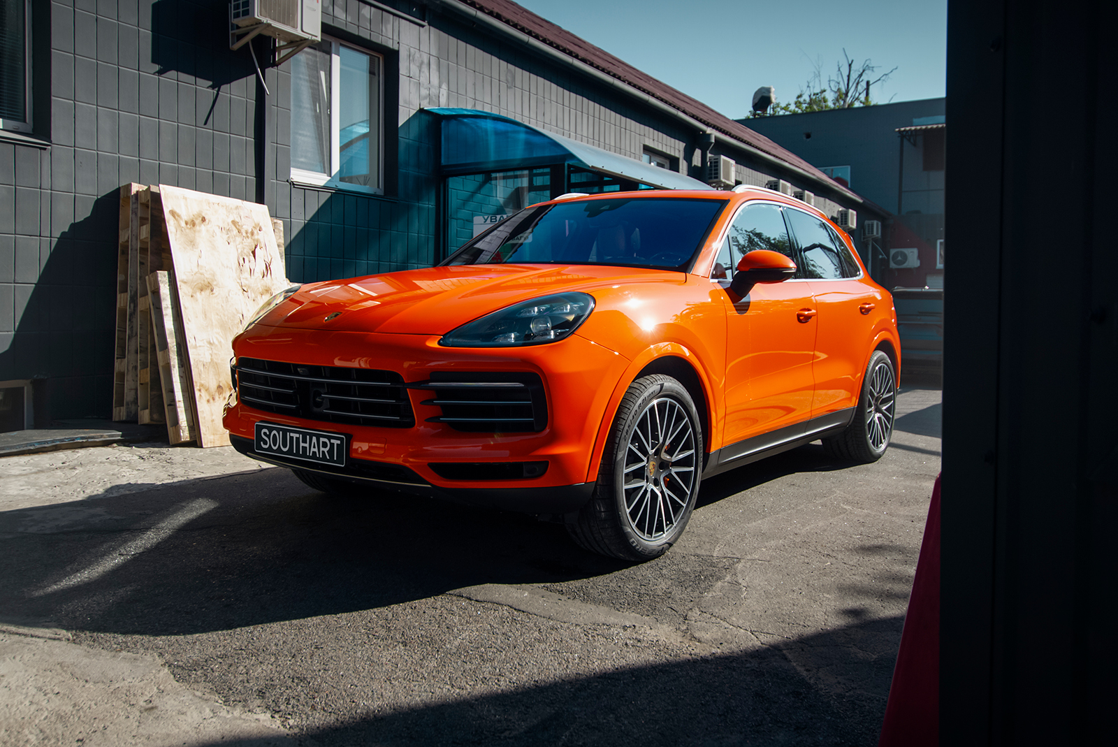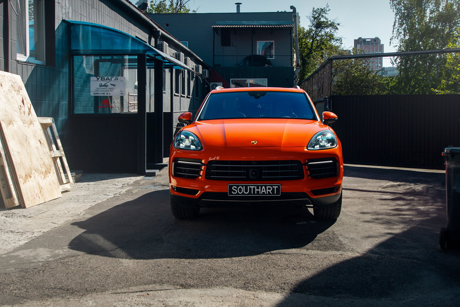 Porsche Cayenne в кольоровій плівці, зі встановленими помаранчевими ременями безпеки