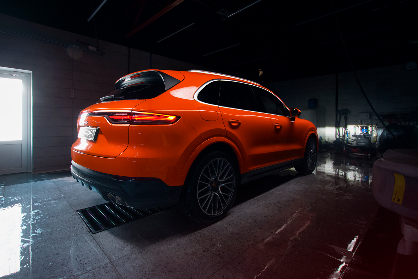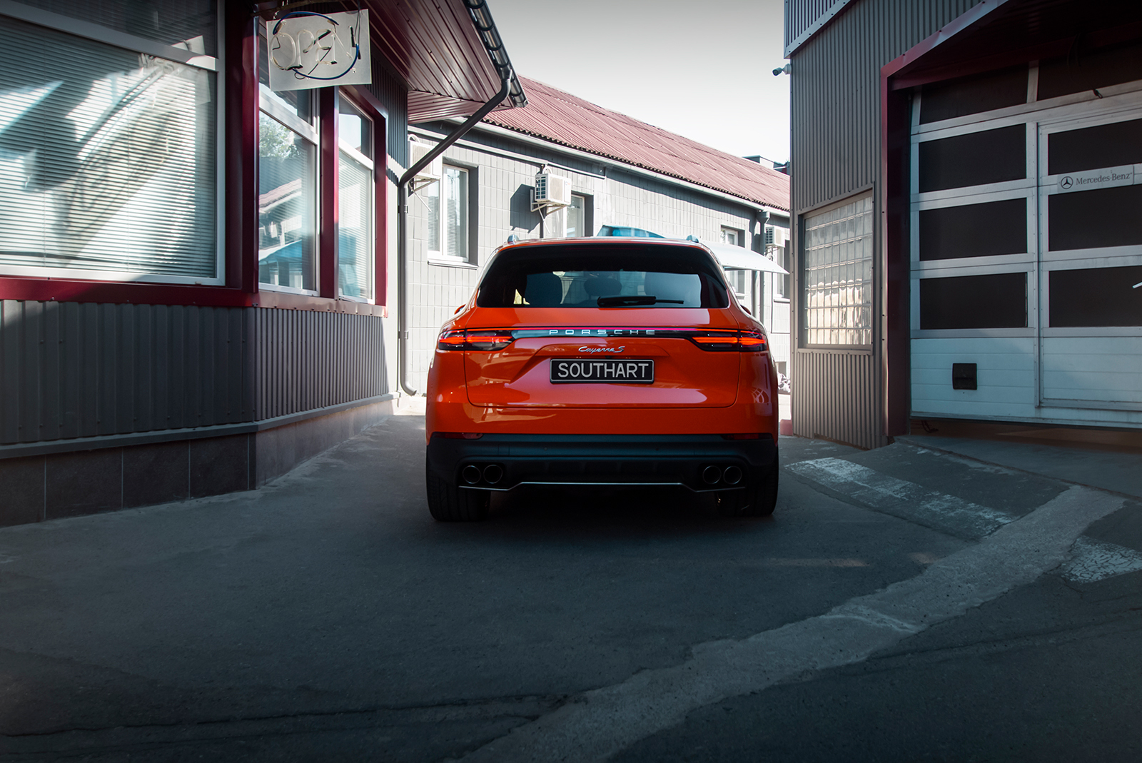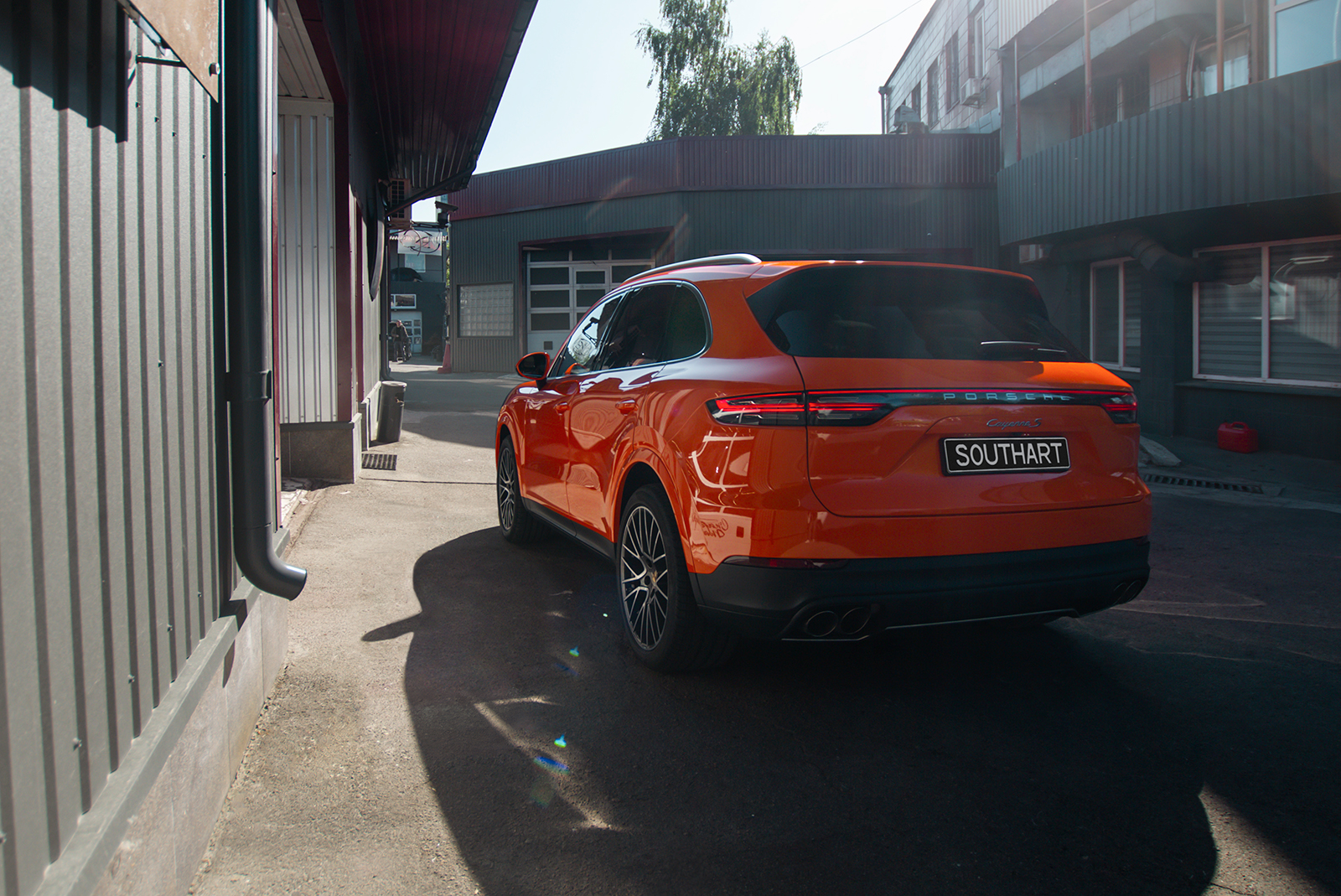 Porsche Cayenne в кольоровій плівці, зі встановленими помаранчевими ременями безпеки