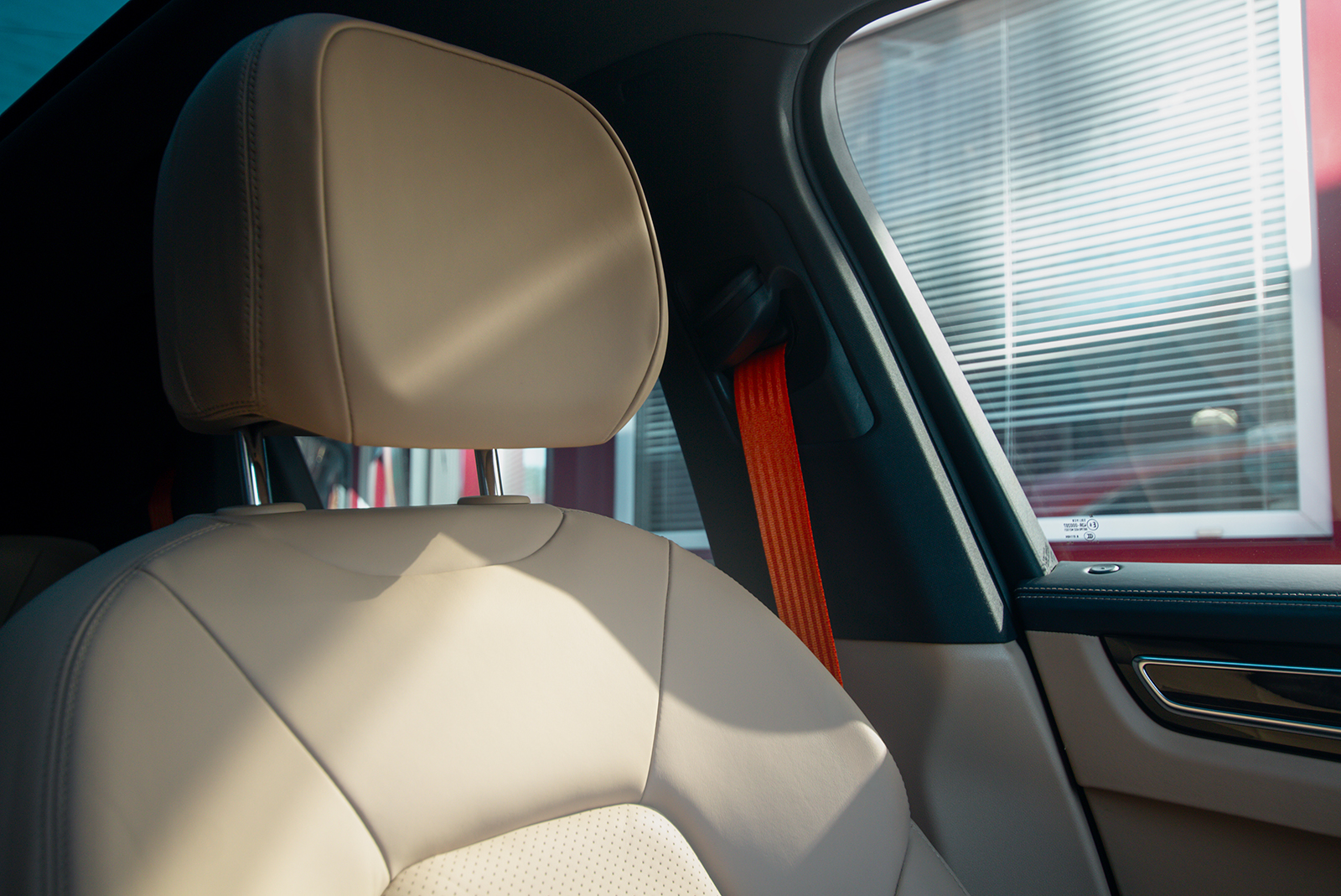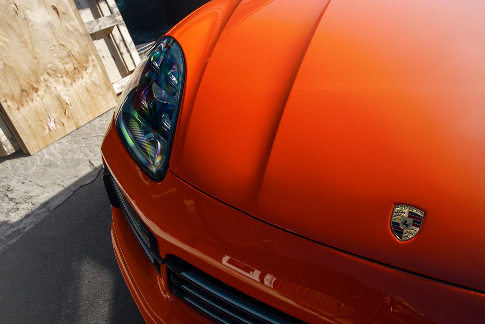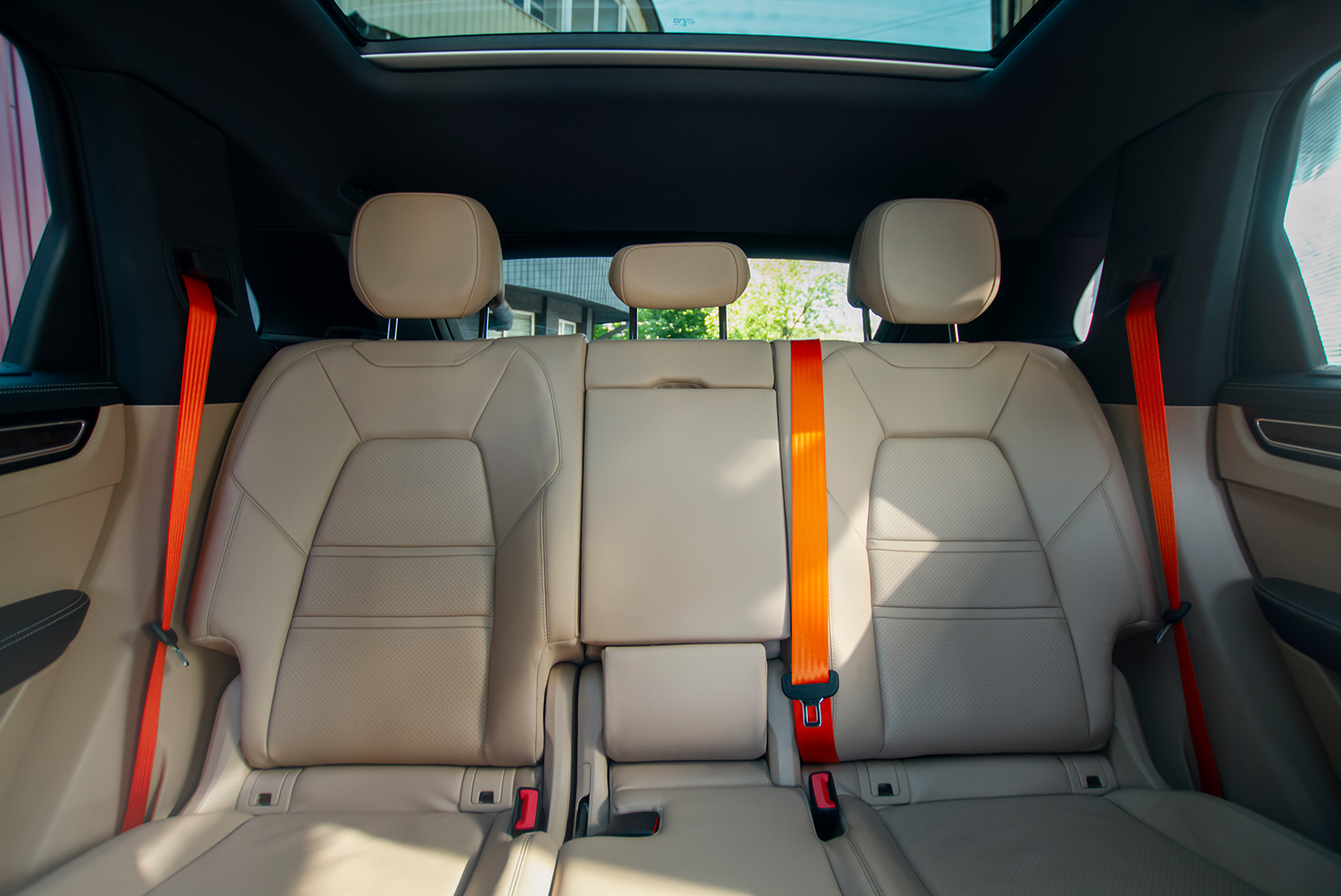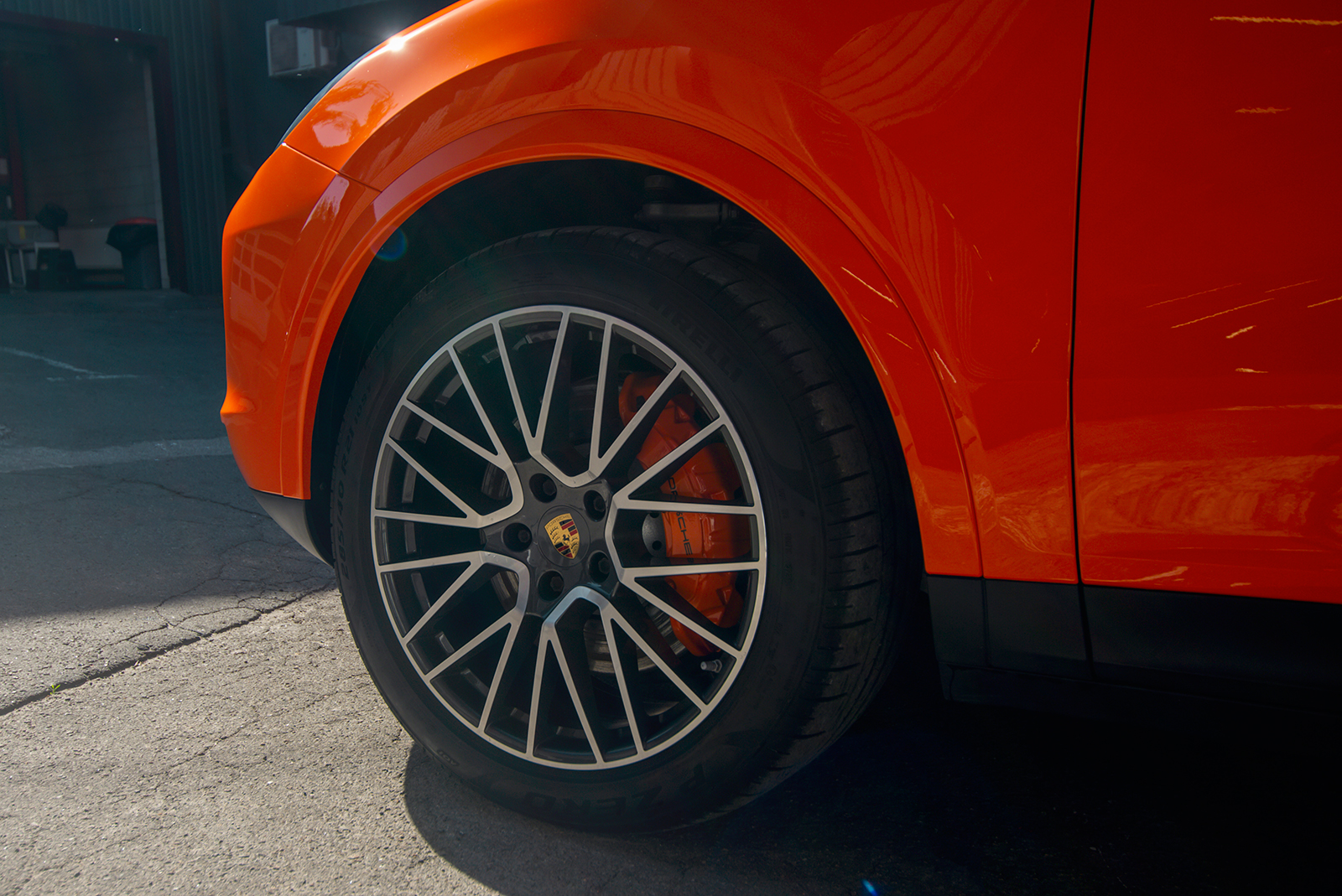 Porsche Cayenne в кольоровій плівці, зі встановленими помаранчевими ременями безпеки