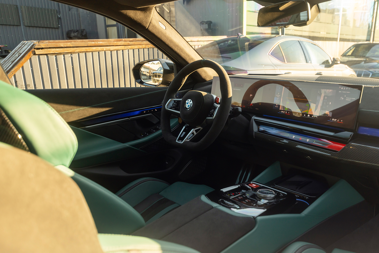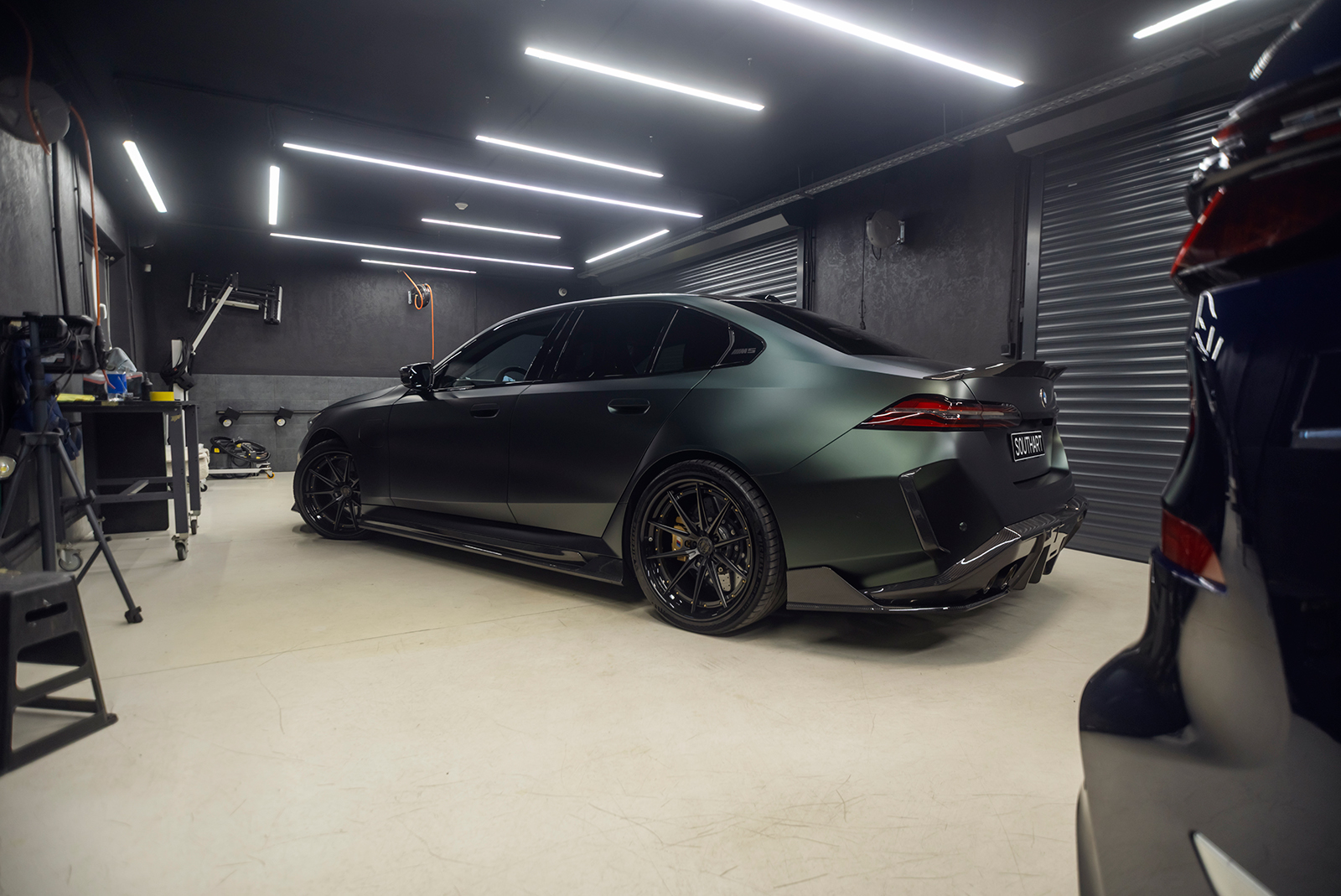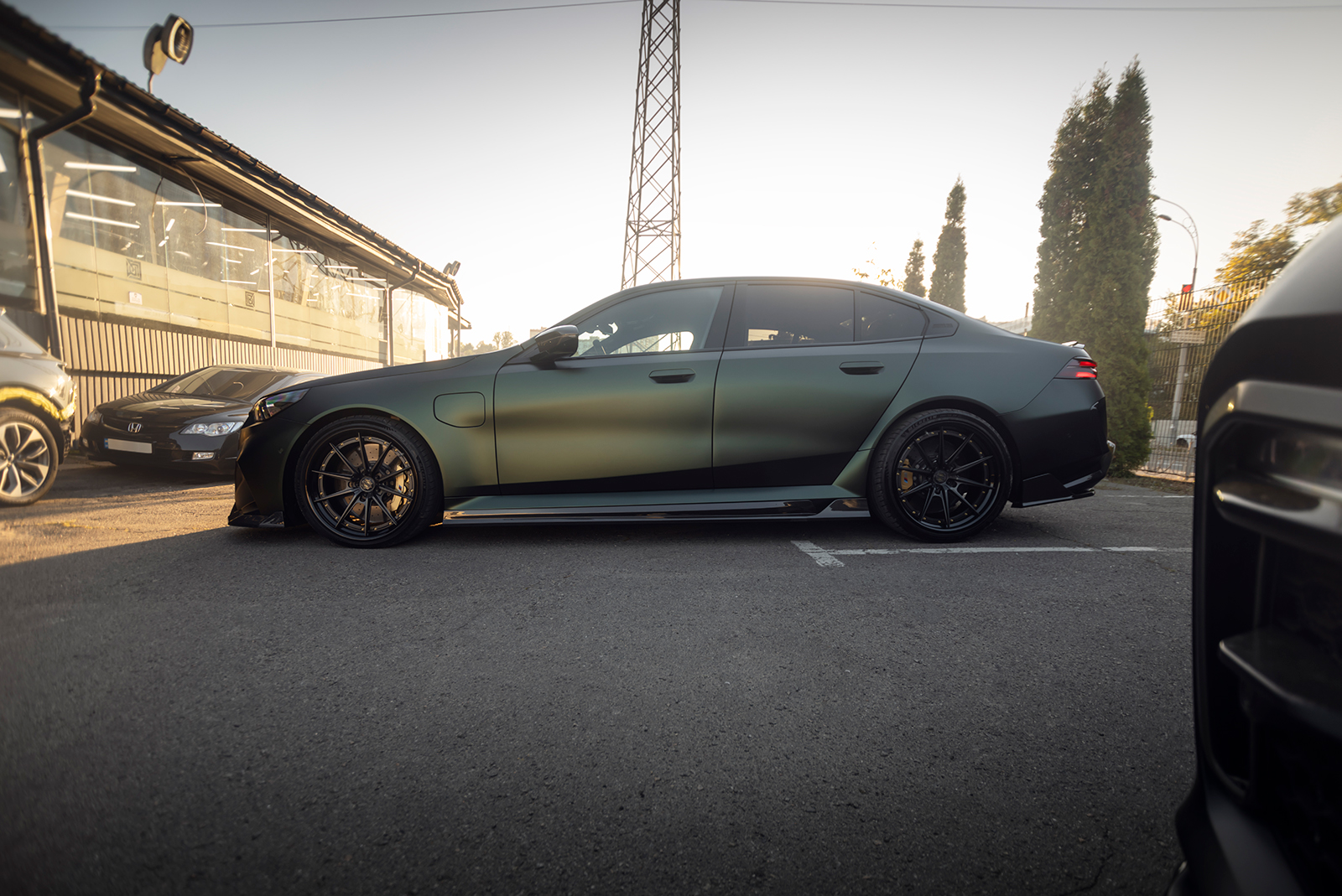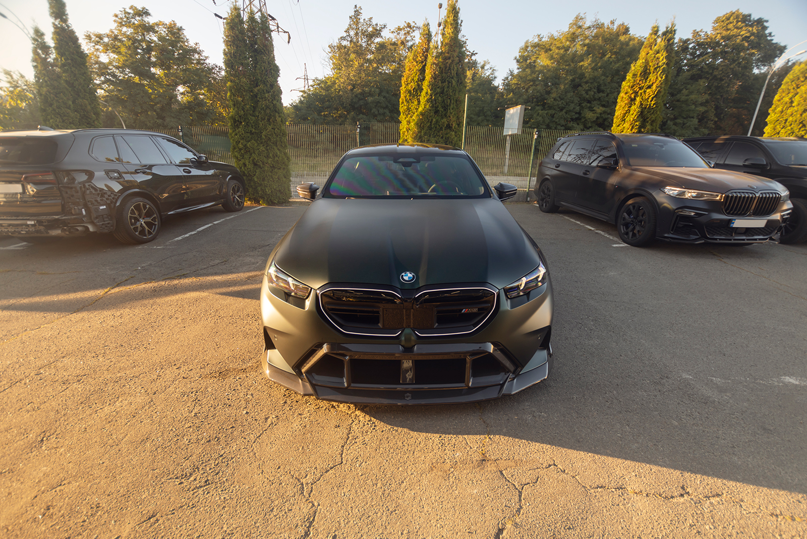 BMW M5 в кольоровій захисній поліуретановій плівці з повним перешиттям салону з шумоізоляцією, та з встановленням колісних дисків