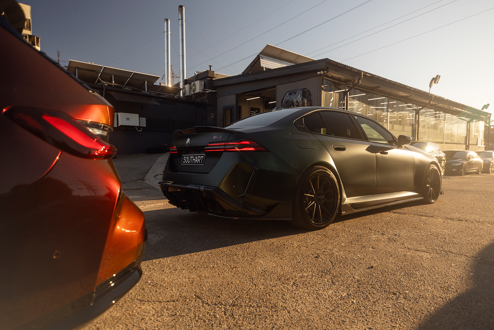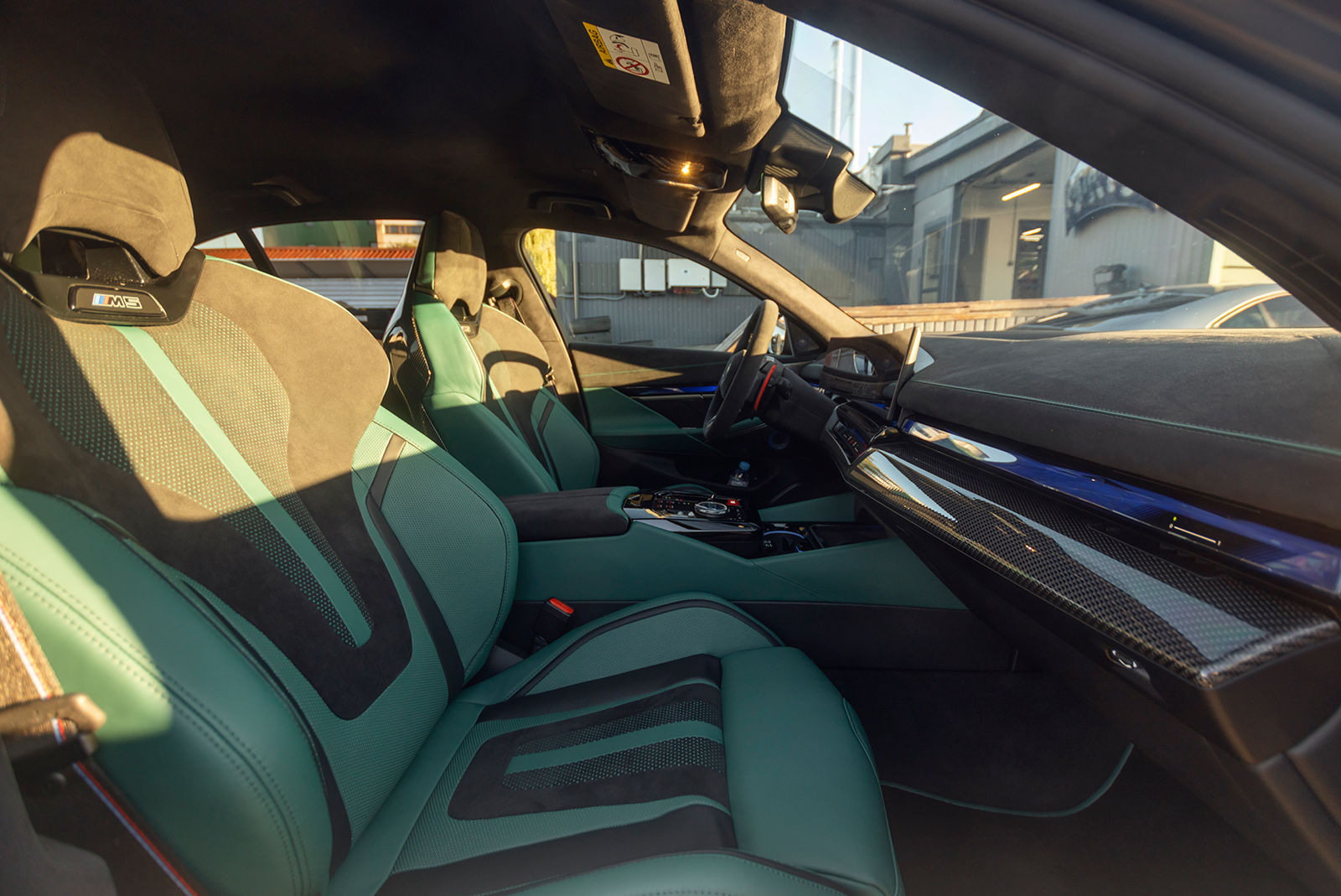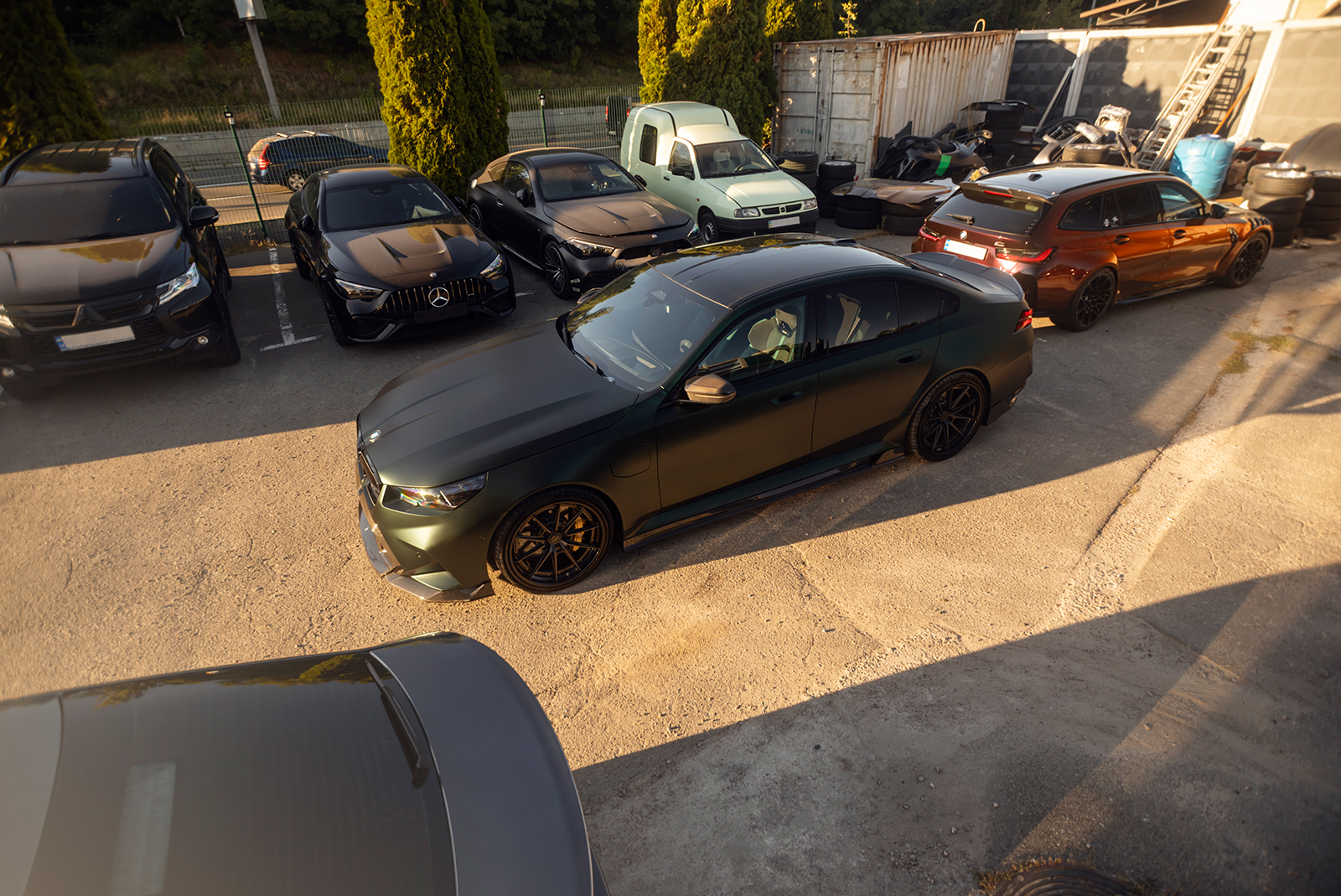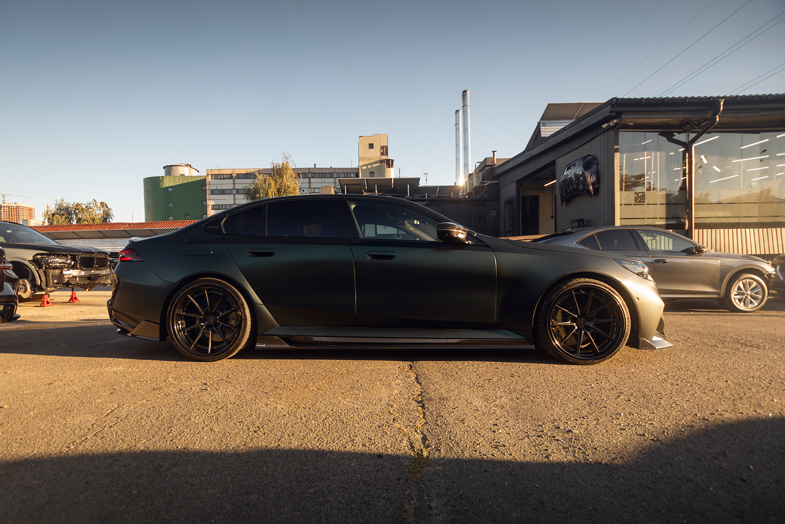 BMW M5 в кольоровій захисній поліуретановій плівці з повним перешиттям салону з шумоізоляцією, та з встановленням колісних дисків